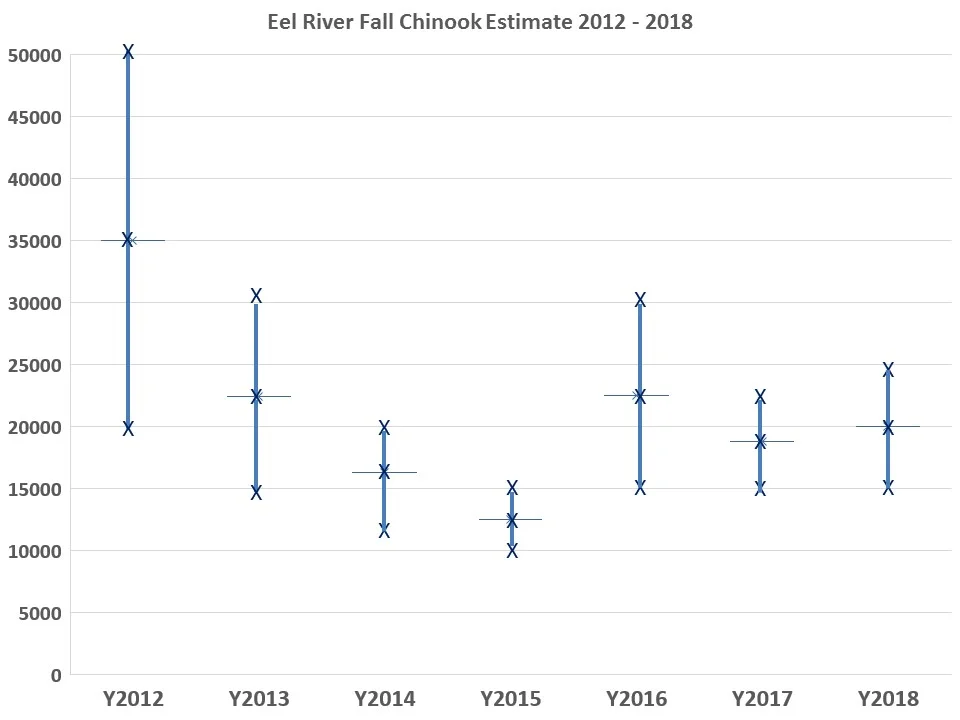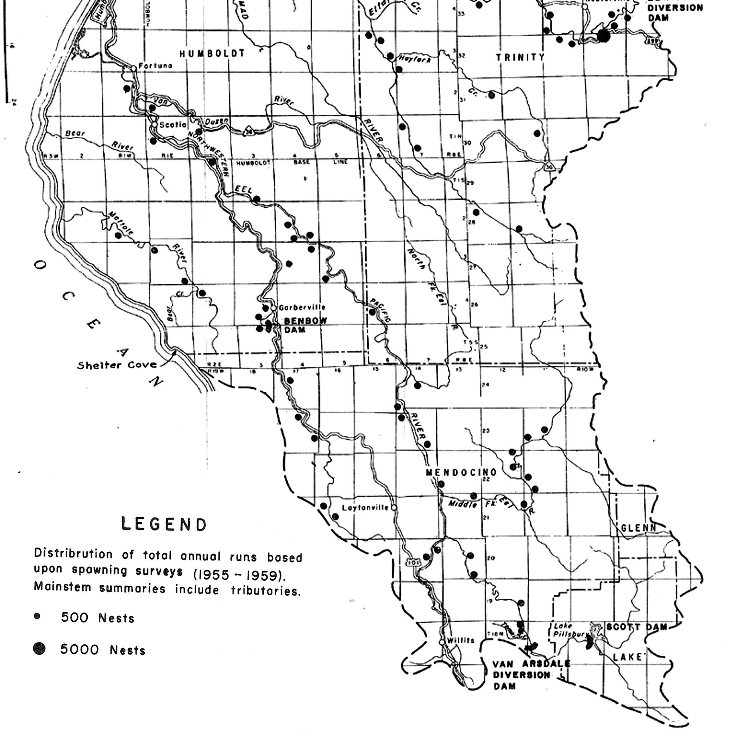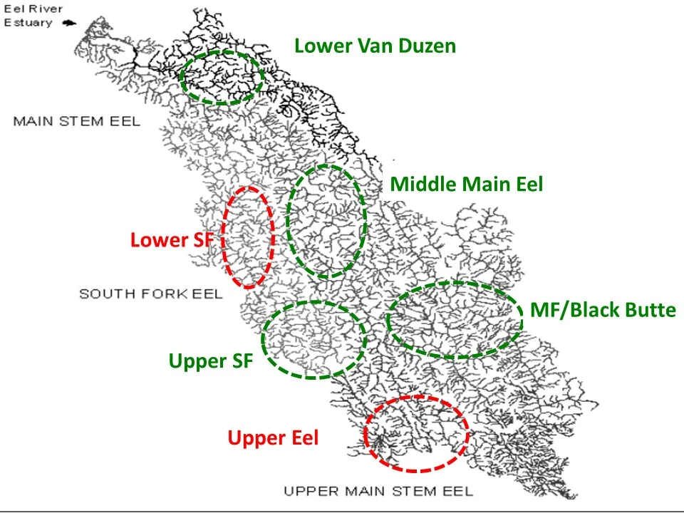 We use U.S. Fish and Wildlife maps of salmon redds based on surveys from 1955-1958 to estimate current capacity in recovered reaches, but returns to some sub-basins like the lower South Fork and upper Eel River above Dos Rios appear in decline (see map below).