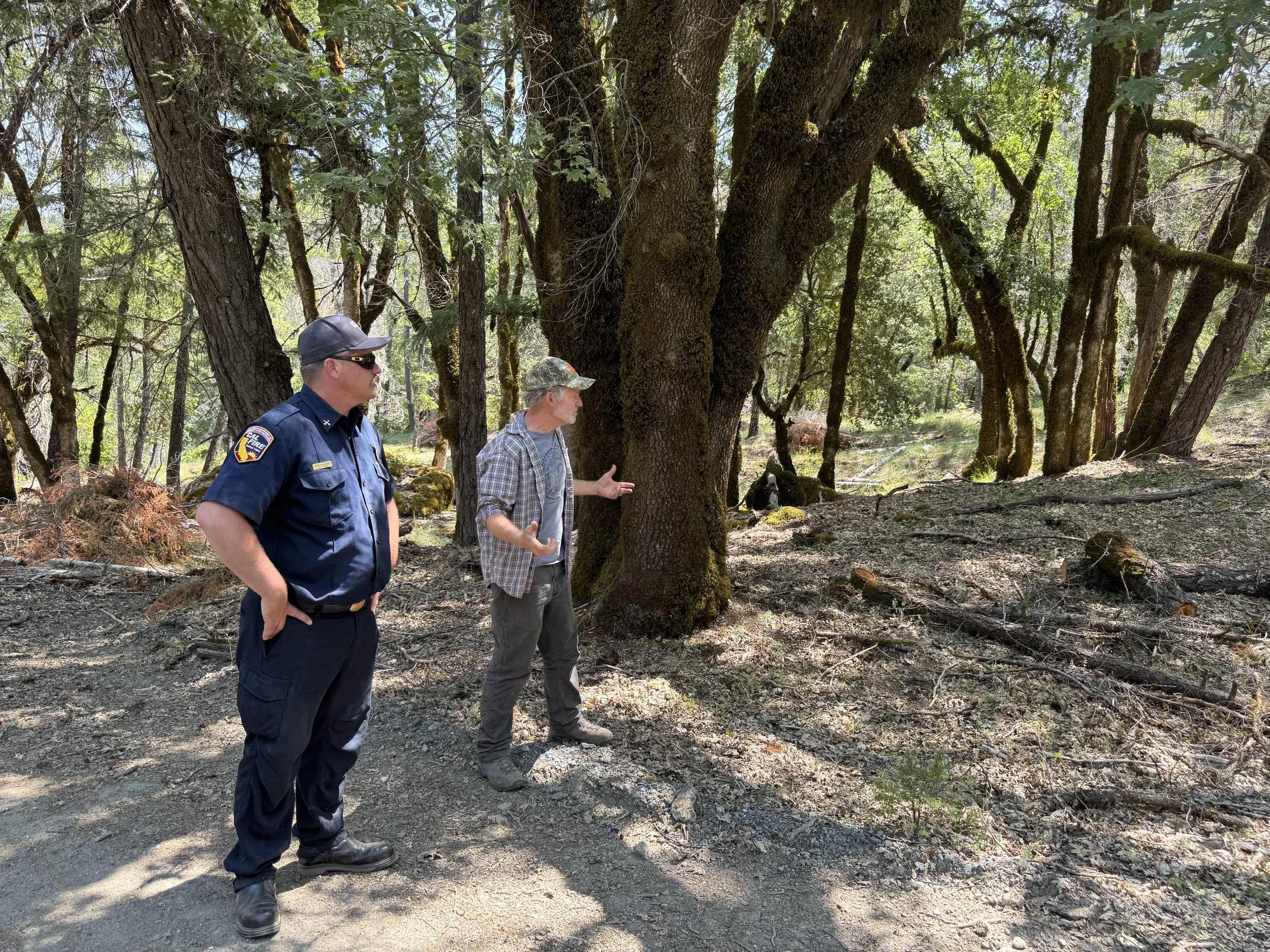 Landowner Steve Brown with RPF Walt Mackelburg of CALFIRE with rejuvenated oaks.