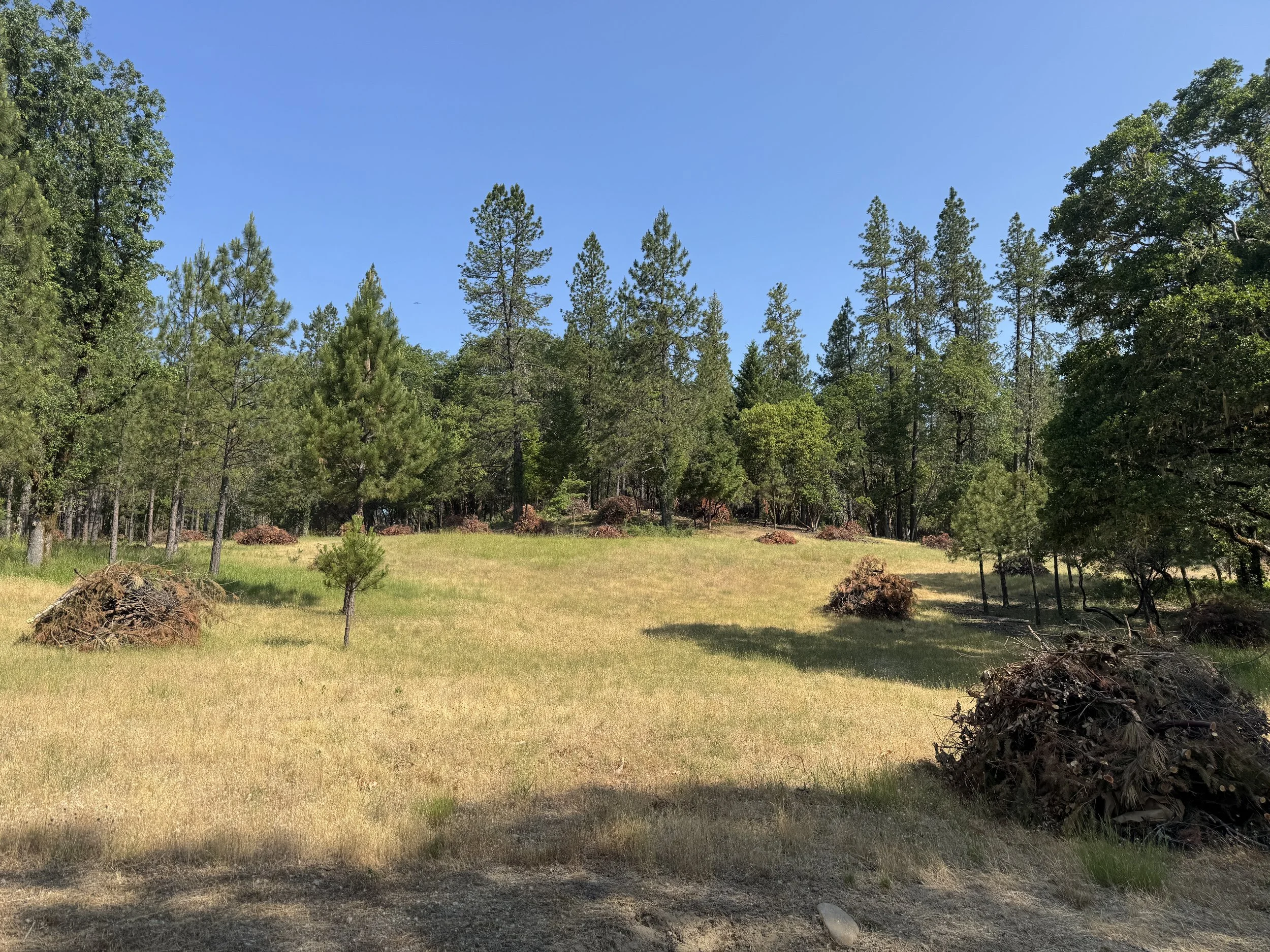 GRAVIER PROPERTY: The Gravier property is near Laytonville off Bauer Road on lower Little Case Creek. Elk Ridge Tree Service thinned 36 acres of forest. Much of the treatment was to remove Douglas fir and dense vegetation below oak trees and to pile materials for burning. Over-stocked conifer/hardwood forest were also the target of thinning. An invasive plant species, Spanish Broom was widespread and crews cut it and piled it with other fuels. When piles are stacked on the edges of meadows, burn scars can be excellent areas for getting native grass plugs to grow.