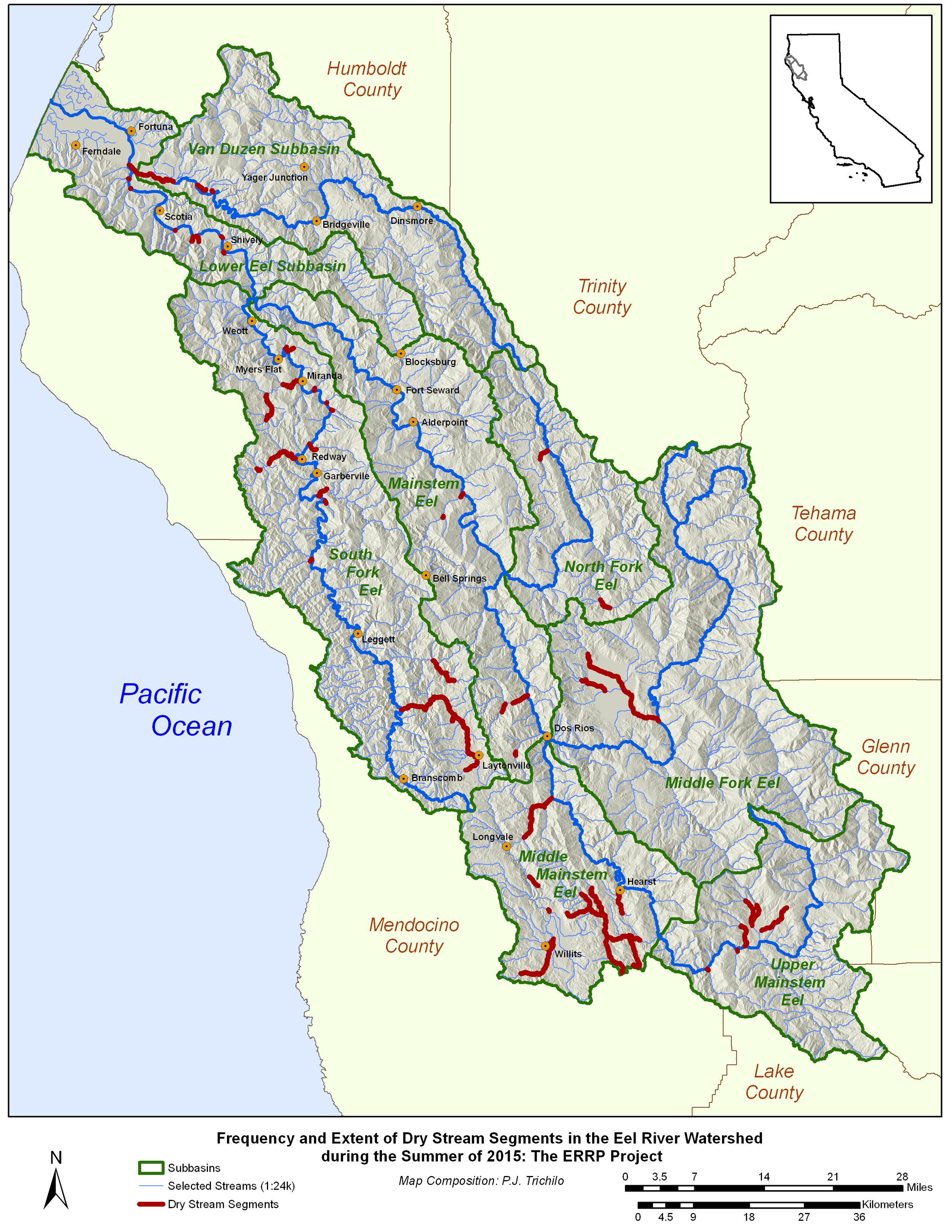 There are currently eight “real-time” U.S. Geologic Survey Stream (USGS) gauges in the Eel River basin main Eel River at Scotia and Fort Seward, South Fork at Miranda and Leggett, the Van Duzen, the Middle Fork Eel, Elder Creek and Outlet Creek.